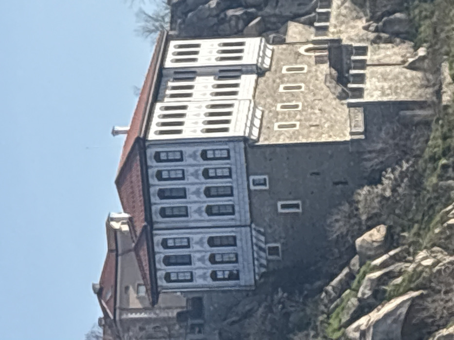 The image depicts the Hindliyan House, a 19th-century Bulgarian National Revival style residential structure, situated on a steep, rocky hillside in the Old Town of Plovdiv, Bulgaria. The building features a robust, two-story stone base seamlessly integrated with the natural rock formations, displaying several small, rectangular, white-framed windows and slit-like openings. A lower stone extension with an arched entrance and crenelated elements is visible to the immediate lower right of the main structure. Above the stone base, two stories of white facade, characterized by significant cantilevered projections, extend outward. The left section of the upper floors presents two rows of four dark-framed, arched windows, with decorative grey patterns beneath. The right section displays two rows of multiple narrower, vertically elongated, dark-framed arched windows. The entire building is topped by a complex reddish-brown tiled roof, featuring multiple chimneys. The surrounding environment consists of barren, grey rock outcroppings and sparse, leafless deciduous vegetation. The sky above is clear and bright blue. No people, animals, or active elements are present in the scene.