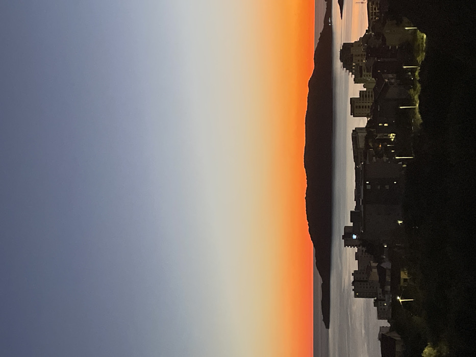 The image depicts an elevated view of Rafailovići, Montenegro, at dusk or dawn. The sky presents a distinct horizontal gradient, transitioning from a light blue-grey at the zenith to a vibrant orange and deep reddish-orange along the horizon line. A calm body of water, identified as the Adriatic Sea, occupies the mid-ground, exhibiting a muted grey-blue color with minimal surface texture. A large, dark, silhouetted landmass, likely a hilly island or peninsula, is positioned centrally across the water, its contours sharply defined against the illuminated horizon. In the lower mid-ground, the cityscape of Rafailovići consists of numerous multi-story buildings, appearing as dark silhouettes. Visible within the urban area are several illuminated streetlights emitting vertical glows, and select windows on buildings display interior lighting. The immediate foreground is obscured by dark, dense vegetation. No individuals, vehicles, or specific actions are discernible within the frame.