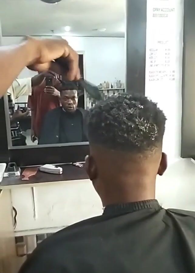 The video takes place inside what appears to be a barbershop. The main focus is on a man getting his hair styled. He is seated in a barber's chair, wearing a black cape, with his back to the camera. The back of his head and hair are visible, with styling product applied. A barber is seen working on his hair with a comb and what may be a hair styling tool. The camera focuses on the barber's hands and the client's hair. A mirror in front of the client shows a reflection of the client, barber, and another person who is taking a picture or video with their phone. The mirror also shows a price list on the wall of the barbershop. The environment includes other barber chairs, a fan, and shelves with products. The tone of the video appears casual, with laughter heard in the background.