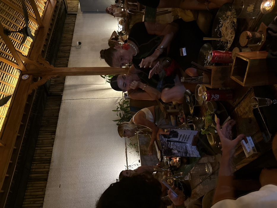 The image depicts a nighttime scene inside an open-air or semi-open restaurant/bar located in Uluwatu, Indonesia. The environment features a thatched roof supported by robust wooden beams, a bamboo-slatted upper wall, and a lower white painted wall illuminated by indirect lighting, creating a warm, dim ambiance. A ceiling fan is visible overhead. In the mid-ground, a group of individuals, predominantly women, are seated at a rustic wooden table. From left to right: * A person partially visible in the foreground, wearing a white shirt, has their hand extended towards a pack of cigarettes placed on the table. * A woman with blonde hair, wearing a white crop top and dark bottoms, is seated, gesturing with her hands as if speaking or reacting. * Next to her, a woman with dark hair pulled back is looking down, with one hand near her chin. She wears multiple bracelets. * Adjacent to her, a woman with dark hair tied in a bun is engrossed with a mobile phone held in both hands. She wears prominent red, flower-shaped earrings, a shell necklace, and multiple bracelets. * In the background, further individuals are faintly visible at another table, engaged in similar activities. The large wooden table is laden with various objects: plates containing remnants of food (including noodles), multiple glasses, bottles, two red Coca-Cola cans, small bowls, a lit candle in a glass holder, a menu, and a pack of Marlboro cigarettes. Some wooden containers are also present on the table. The individuals are engaged in dining, drinking, socializing, and using mobile phones within this relaxed setting.