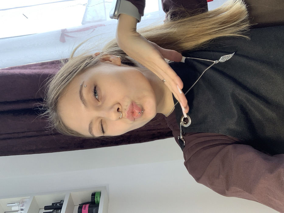 An image taken indoors depicts a young adult female posing for a selfie. The subject has light brown or blonde hair, pulled back into a ponytail, and light blue eyes. She is winking with her right eye and pouting her lips. Facial piercings include two small studs above her left eyebrow, a silver septum ring, and two silver studs on her lower lip. She wears a silver chain necklace with a wing-shaped pendant. Her attire consists of a long-sleeved brown top and a black smock or apron secured by a silver clasp and ring on her left shoulder. A silver-toned ring is visible on her left ring finger, and a smartwatch with a light-colored band is on her left wrist. Her left hand is raised, with fingers extended, featuring long, light-colored artificial nails. The background to the left features a white wall with a white shelving unit containing several small bottles, likely nail polish, and two small jars, one pink and one green. To the right, a dark brown curtain partially obscures a lighter, possibly white or sheer, curtain and a window, which has a small pink ribbon visible near its top right corner. The lighting suggests an indoor setting, likely a private room or a beauty salon. While the image depicts an indoor scene without specific city markers, the stated location is the city of Фоки, Russia.