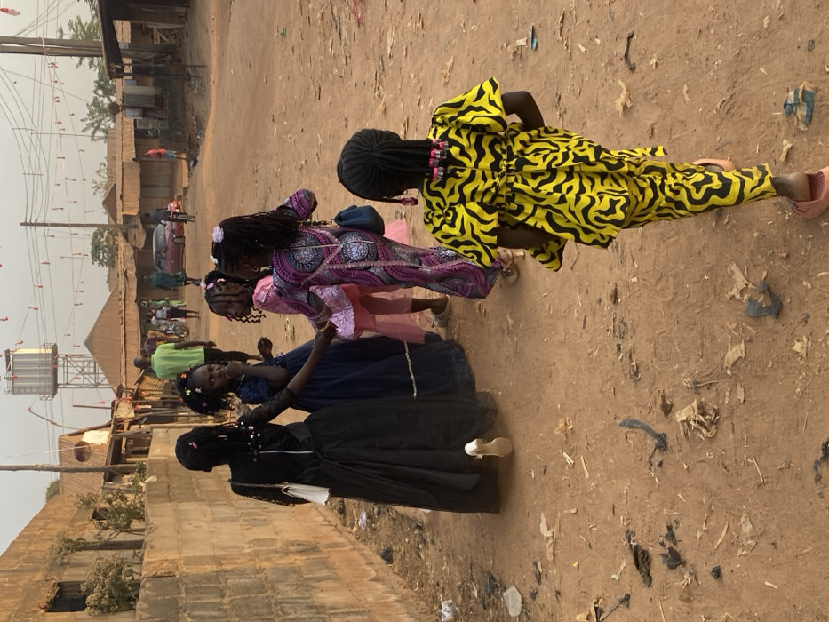 Five young girls, dressed in varying colorful outfits, stand in a line on a dirt road. The first girl wears a black dress, followed by a girl in a blue dress. A girl in pink follows the blue dress. The next girl wears a bright pink and purple patterned dress. The fifth and final girl has on a yellow and black patterned outfit. A few buildings and other people are visible in the background. Debris litters the dirt road.