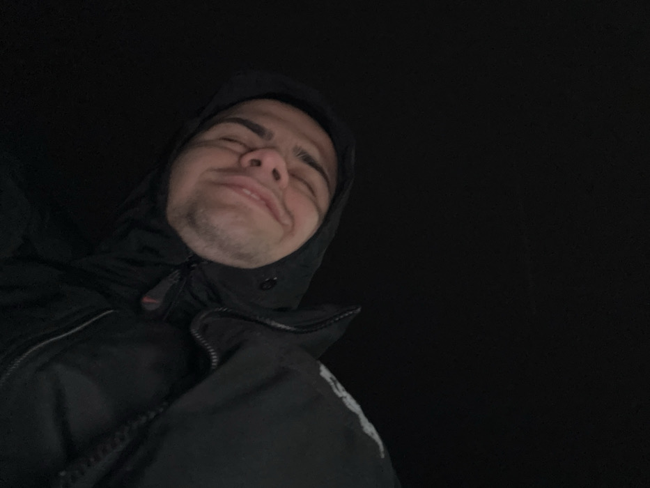 The image depicts a close-up, upward-angled portrait of a single individual, presumably male, with light skin, dark hair, and short facial hair, including a mustache and stubble. The person is oriented horizontally within the frame, with their head positioned towards the right side, looking upwards towards the camera. The individual is smiling broadly, with their eyes partially closed. They are wearing a dark, possibly black, hooded jacket. A prominent zipper is visible down the front of the jacket, and a white or light-colored marking or design is present on the left forearm area of the garment. The background is completely dark, providing no discernible environmental details. This scene is located in Stara Zagora, Bulgaria.