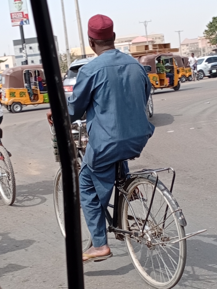 - "A male individual is depicted from behind, riding a black bicycle on an asphalt road in Gawuna, Nigeria" by FM-TtYM52, licensed under CC BY 4.0