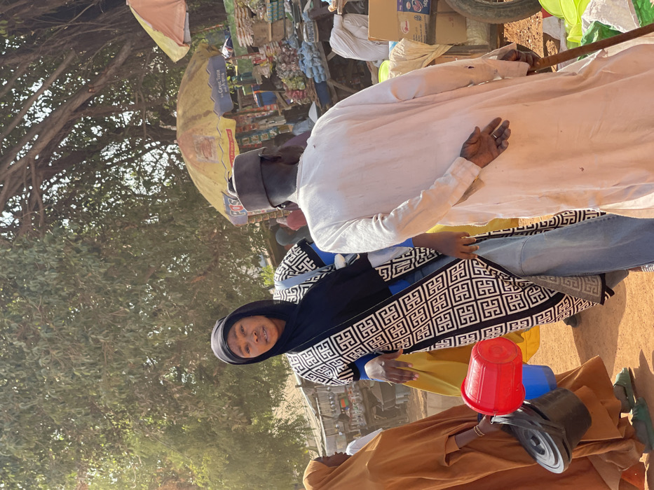 The image depicts an active outdoor market scene in an unnamed city. Sunlight illuminates the dusty ground and subjects. In the mid-ground, a woman with a neutral expression faces the camera. She wears a black head covering, a long black and white geometric-patterned open outer garment, a light blue long-sleeved shirt, and light blue jeans. A black shoulder bag is visible on her right side. Her right hand is slightly extended, and her left arm is bent. To the woman's right, a man stands with his back to the camera, looking towards the right side of the frame. He wears a grey cap and a long, light-colored tunic or robe that appears stained. His right hand is behind his back, gripping a visible stick or cane, and a ring is present on one of his fingers. On the far left, a third individual, partially visible and facing right, wears a loose, tan-colored garment. This person carries a red plastic bucket in their left hand, along with a black pot and a smaller blue container below it. Green sandals are visible on their feet. The environment includes a large tree with dense green foliage in the upper background. Several market stalls are visible, topped with yellow and yellow-orange umbrellas. One yellow-orange umbrella displays "POS" and "Great Taste" branding. Various goods, including packaged items and possibly produce, are displayed on the stalls. The ground is unpaved, consistent with a busy outdoor market setting. Additional individuals are blurred in the background, suggesting a crowded area.
