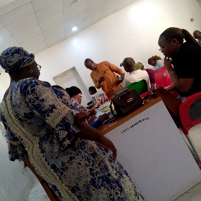 The image depicts an indoor administrative or instructional environment in Lokoja, Nigeria, characterized by white walls and a white ceiling with recessed lighting. At least seven individuals are present. In the foreground, a dark-skinned woman with glasses, wearing a blue, white, and gold patterned traditional dress and matching headwrap, is positioned with her back partially to the camera, on the left. Adjacent to her is a light-brown tabletop with a white front panel that features black lettering reading "KSSHI NHIS 056." On the table, a dark brown satchel, a green and white item labeled "ZIMOTEK," and multiple smartphones or small tablets are visible. Several individuals are seated at this table: a woman with glasses is observed looking down at a device or document; a dark-skinned man in an orange traditional long-sleeved top stands, leaning over the table, holding a mobile phone in his left hand; and another person wearing a light-colored cap is partially visible. Further to the right, a dark-skinned woman with glasses and braided hair in a ponytail is seated on a red plastic chair, wearing a black top, with her right hand near her chin. Additional individuals are vaguely visible in the background, seated or standing, engaged in similar activities.