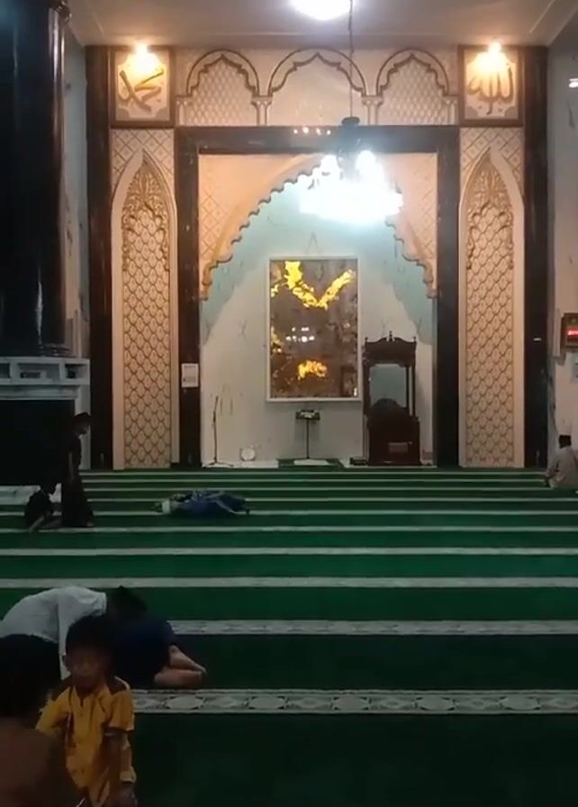 interior of a mosque. A carpeted prayer area, with green horizontal stripes, is the main focus. Several people are present, including some children. A few individuals are lying down on the carpet, while others are sitting. A large, ornate archway is visible at the far end of the room. Inside the archway is a picture. The mosque’s architectural details include light fixtures.