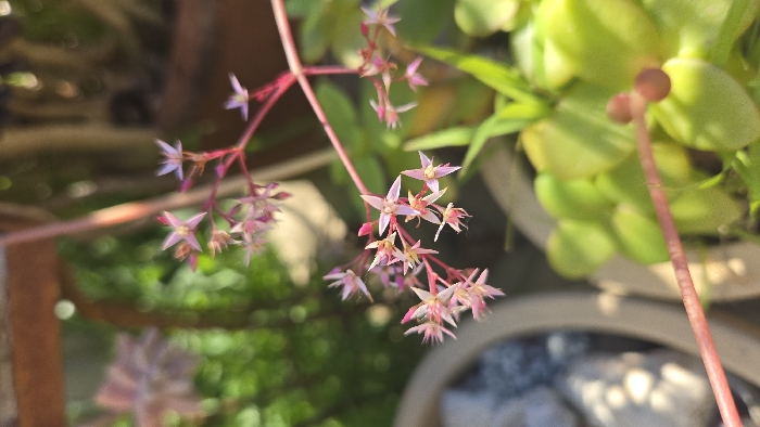 A close-up, high-angle view captures multiple clusters of small, star-shaped flowers, approximately 5-7mm in diameter, with five distinct pinkish-purple petals and central yellow anthers. These flowers are borne on slender, reddish-pink stems, which branch upwards and outwards from the lower frame. Below the main flowering clusters, bright green, fleshy, ovate leaves characteristic of a succulent plant are visible, some exhibiting a yellowish-green hue, particularly in the lower right quadrant. The upper rim of a light-colored, possibly concrete or terracotta, planter pot is visible along the left edge, containing small, irregular, light-grey stones or pebbles. A blurred reddish-brown linear object, potentially a wooden structure, is present in the upper left background, above further out-of-focus green foliage. The scene is illuminated by direct sunlight, creating bright highlights and a shallow depth of field. No human or animal subjects are present. The location is in the city of Lompoc, United States.
