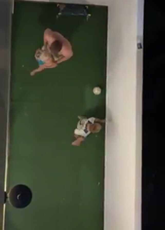 From an elevated, perpendicular perspective, the video captures a scene inside a rectangular room with a green turf floor. Two small soccer goals are positioned at opposite ends of the room. An adult male, mostly undressed, is seen standing near one goal and holding a small child. A slightly older child in a white and blue soccer uniform stands on the opposite side of the room with a soccer ball. The children are both blonde. The soccer ball is passed between the children. A black lamp is placed to the bottom left of the screen. The room has white walls.
