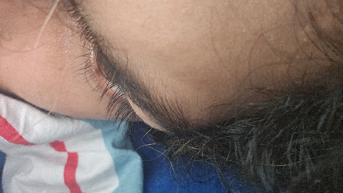 close-up view of a person's head resting on a pillow. The individual has dark hair and eyelashes. The pillow has a pattern with white, blue, and red colors. The skin around the eye appears smooth, and the eyelashes are thick and dark. The hair is short and styled close to the head. A single white hair stands out near the face.