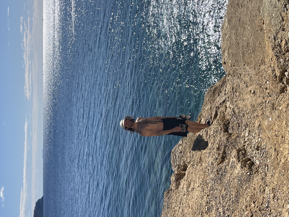 - "An adult male subject is positioned on a rugged, light-brown rocky cliff overlooking a vast expanse of water under a clear blue sky with sparse clouds, in Megalochori, Greece" by FM-CRvhO2, licensed under CC BY 4.0