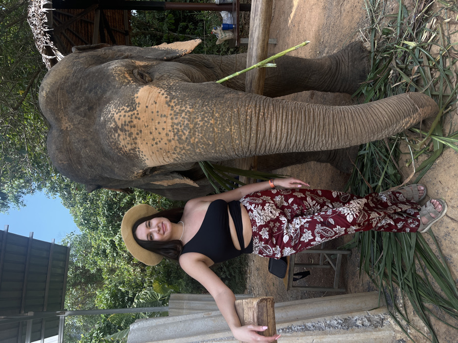 A young woman in a black top, patterned pants, and a straw hat poses next to an elephant