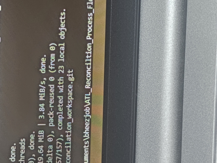 A close-up image depicts a laptop screen displaying technical text, primarily white characters on a dark background, indicating command-line interface or programming output. Visible text includes "MiB | 3.84 MiB/s, done.", "completed with 23 local objects.", "conciliation_workspace.git", and a file path segment "documents\\bheezjob\\ATL_Reconciltion_Process_Flo". Subtle vertical color distortions (green and orange hues) are present across the lower part of the screen's display area. Below the screen, the laptop's metallic grey, finely textured body or palm rest occupies the bottom half of the frame. No individuals, actions, or specific environmental details identifying the location within Iganmu, Nigeria, are discernible in the image.