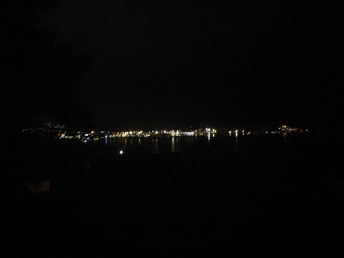 A dark, night-time scene depicts a distant city skyline illuminated by blurred, glowing lights reflecting on water. The horizon is dimly visible, with indistinct shapes suggesting buildings or structures. Dark clouds or shadows fill the upper portion of the image, obscuring the sky. The foreground is dominated by darkness, with only subtle hints of texture or shapes. The overall impression is one of a blurred, dimly lit urban landscape at night.