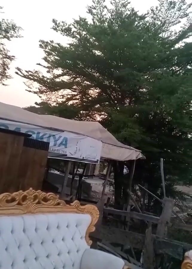 partially visible ornate sofa with a white tufted back and gold trim in the foreground. Behind the sofa is a commercial structure, covered by a canvas roof with a sign bearing the word "ASKIYA" and what appears to be a phone number. Beyond the structure, there is a large green tree filling much of the top half of the frame. The sky is bright, suggesting it is either early morning or late afternoon. The lighting is subdued, and the overall environment appears somewhat cluttered.