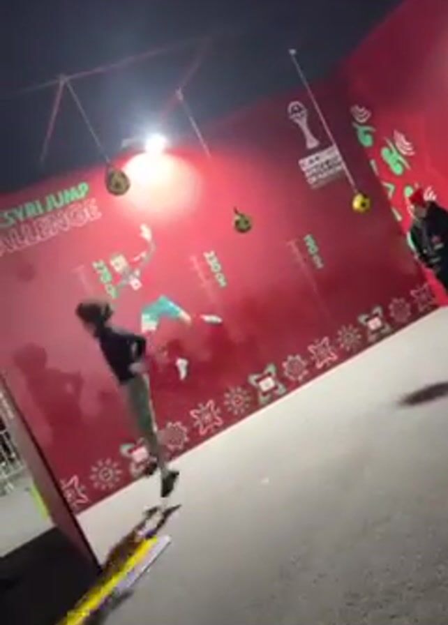 person in grey pants and a dark shirt jumping up to a red wall with a graphic on it. The wall has writing on it, including the words "NEYMAR JUMP CHALLENGE" and measurements like "278 CM," "230 CM," and "190 CM." There are also images of soccer balls and a logo. The video is filmed at night, and there are shadows on the ground. A second person in black clothing walks past in the background.