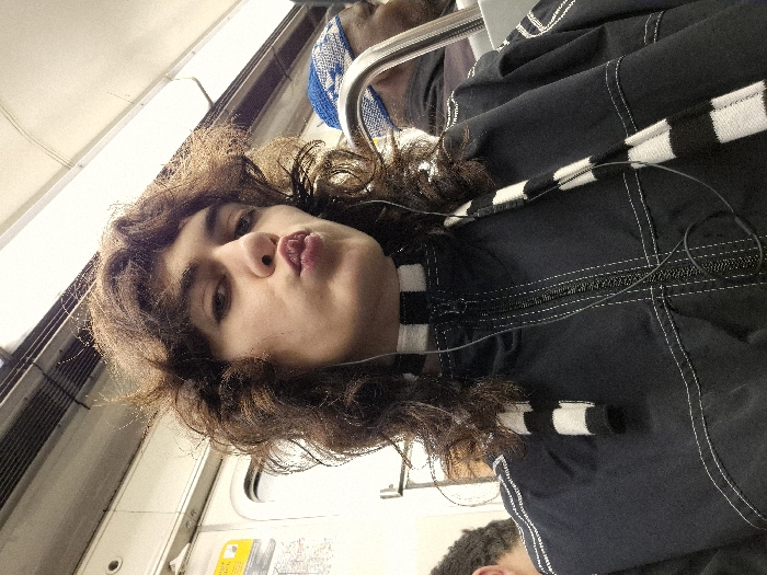 - "An individual with wavy brown hair, appearing to be a young adult, is depicted from the chest up, facing forward with lips puckered, suggesting a deliberate pose for a photograph" by FM-O7Vkg2, licensed under CC BY 4.0