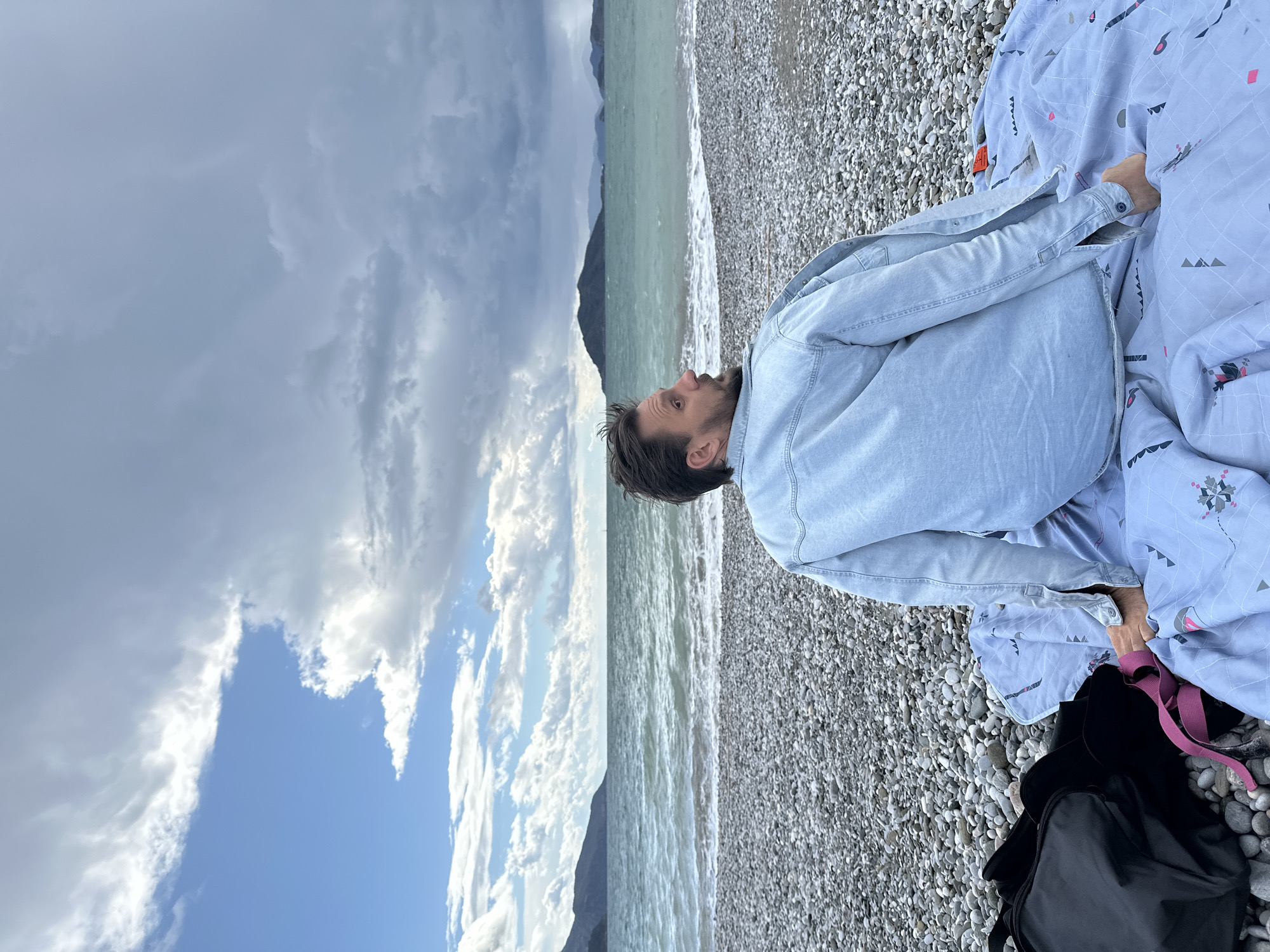 A man sits on a pebble beach in Fethiye, Turkey, looking out at the water. He wears a light blue denim jacket and sits on a light blue patterned blanket. A black bag with a pink strap sits next to him. The sky is partly cloudy, with a mix of blue sky and dark storm clouds. Mountains are visible in the distance across the water.
