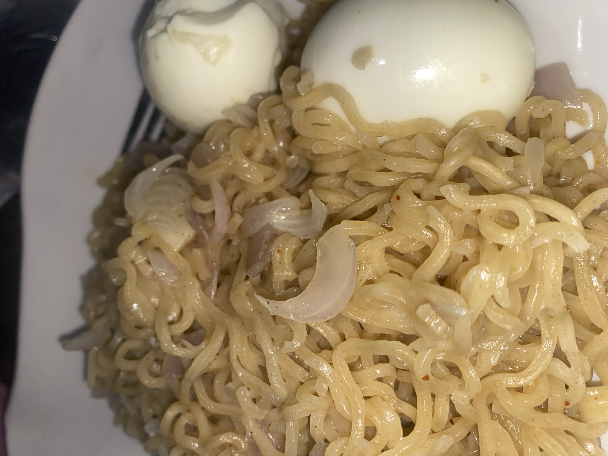 A close-up, high-angle view captures a serving of prepared instant noodles on a white plate, located in Rido, Nigeria. The noodles are light beige, curly, and appear coated in a light sauce, with visible specks of reddish seasoning. Scattered throughout the noodles are translucent, off-white slices of onion. Two whole, peeled hard-boiled eggs, white in color, are positioned on the right side of the plate, partially submerged in the noodles. A metallic fork tines are partially visible between the upper egg and the noodles, indicating the presence of cutlery. The background is dark and out of focus, suggesting an indoor setting. No individuals are visible.