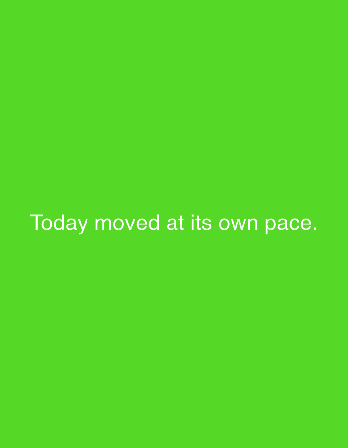 A vibrant green background fills the frame. White text is centered horizontally and vertically, reading "Today moved at its own pace." The simple composition and contrasting colors draw attention to the reflective statement. The overall aesthetic is clean and calming.