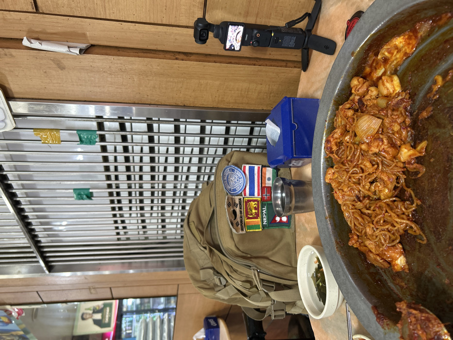 The image depicts an indoor dining scene at a restaurant in Seoul, South Korea. In the foreground, a large, circular metal pan contains a partially consumed stir-fried dish of red-sauced noodles, chicken or seafood pieces, and sliced onions. To the left, a small white bowl holds green seaweed, and a metal cup rests next to it. Behind these items, a tan tactical backpack is visible, bearing multiple embroidered flag patches including Republic of Korea, Nepal, Sri Lanka, Thailand, India, Norway, and a circular United Nations Peacekeeping Operations logo. A blue tissue box labeled "cass" is situated beside the backpack. To the right of the food pan, a black DJI Osmo Pocket camera on a small tripod stands on the table, pointed towards the meal, with its screen displaying an image. The background features a wall of closely spaced vertical metal bars, with two green and two yellow rectangular labels taped to them. A mirrored surface on the far left reflects a portion of what appears to be an adjacent retail space or convenience store, including a "Sommer" beverage advertisement featuring a man.