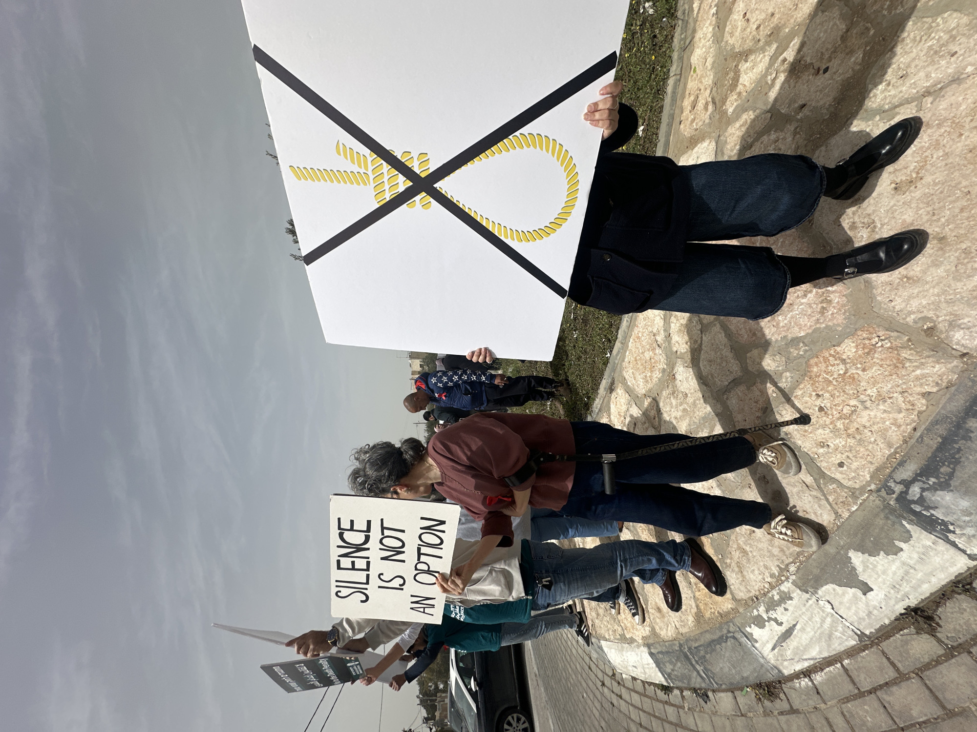 A group of protestors stand on a stone-paved curb, holding signs. One sign displays a drawing of a noose marked with two intersecting black lines. Another sign reads "SILENCE IS NOT AN OPTION" in bold, vertical letters. Another sign in the group reads "لا لقانون الإدام السري / to the Death Penalty". A black car is visible to the left of the protestors. Some people pass by behind the protestors. The sky is overcast.