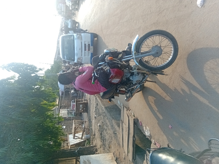 A person in a pink shirt rides a red motorcycle on a street. A white van is visible in the background, along with other vehicles. Buildings and trees line the side of the street. The motorcycle casts a shadow on the road. Debris and litter can be seen near the curb. The sky appears bright and clear.