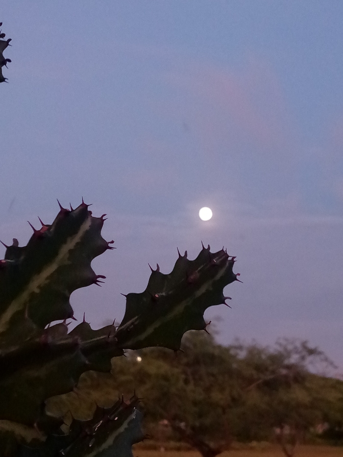 The scene, set in Las Guevaras, Venezuela, depicts an outdoor environment during twilight or early night. In the immediate foreground, a dark green, multi-branched succulent or cactus, possibly *Euphorbia trigona* given its segmented structure and prominent reddish-brown spines, occupies the left and central-lower portions of the frame. The plant features ridged edges with sharp spines and subtle lighter green vertical striations along its main body. A blurred, dark landscape of indistinct trees and foliage forms the distant background. The sky, which comprises the upper two-thirds of the image, is a muted purplish-blue, displaying faint cloud formations. A single, luminous, circular moon is visible slightly above the horizontal center, to the right. There are no individuals, explicit actions, or interactions depicted.