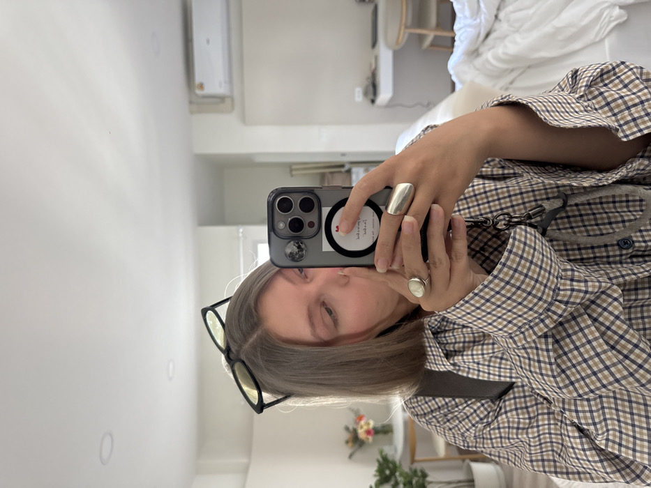 A person takes a selfie in a mirror, holding an iPhone. The phone has a ring stand and a moon sticker on its case. The person wears glasses perched on their head, along with a plaid button-down shirt. Two silver rings adorn their fingers. The background shows a bedroom with a bed, white walls, and a glimpse of a flower arrangement on a table.
