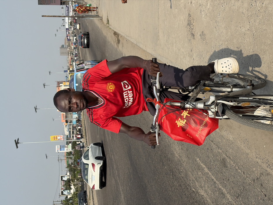 An adult male on a bicycle is positioned centrally on a paved road in Jakande, Nigeria, under a clear sky
