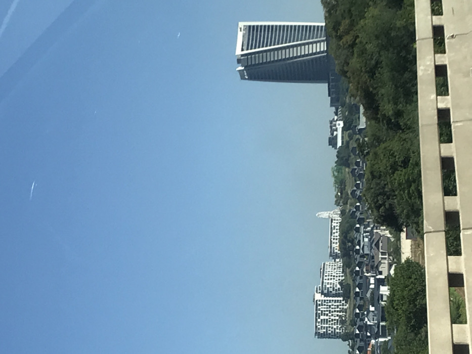 A daytime shot of a cityscape with a blue sky overhead. A tall, modern building with a unique, slanting design is visible. Trees line the foreground, obscuring some buildings. A Ferris wheel can be seen in the distance. Residential buildings with dark roofs are also present. A concrete structure with square openings is positioned on the right side of the frame.