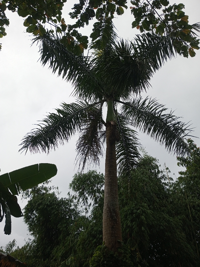 A tall palm tree dominates the frame against a cloudy sky. Its fronds extend in a symmetrical pattern. Other foliage surrounds the base and appears in the background, including banana leaves on the left and various trees and greenery. Overhanging branches with broad leaves are visible at the top, framing the palm. The tree's trunk is long and textured.