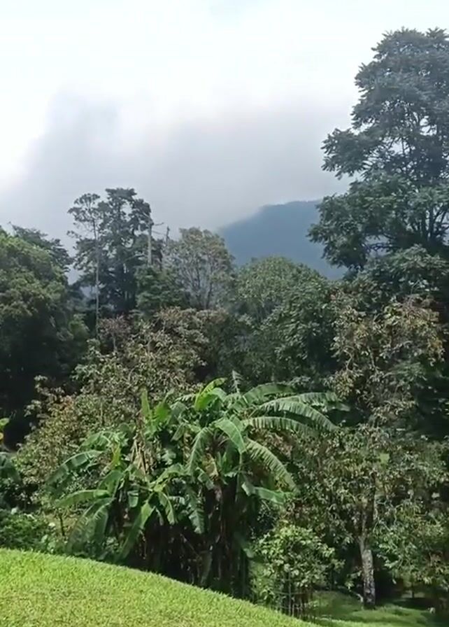 The camera pans slowly across a lush, green landscape. In the foreground, a well-maintained lawn stretches out, leading to a dense collection of trees and foliage. Banana plants are prominent among the shrubbery. Behind the trees, mountains rise up, partially obscured by low-hanging clouds. As the camera moves, a large tree trunk becomes visible on the right side of the frame. In the distance, a bird flies across the sky. The sky is overcast with patches of blue breaking through.