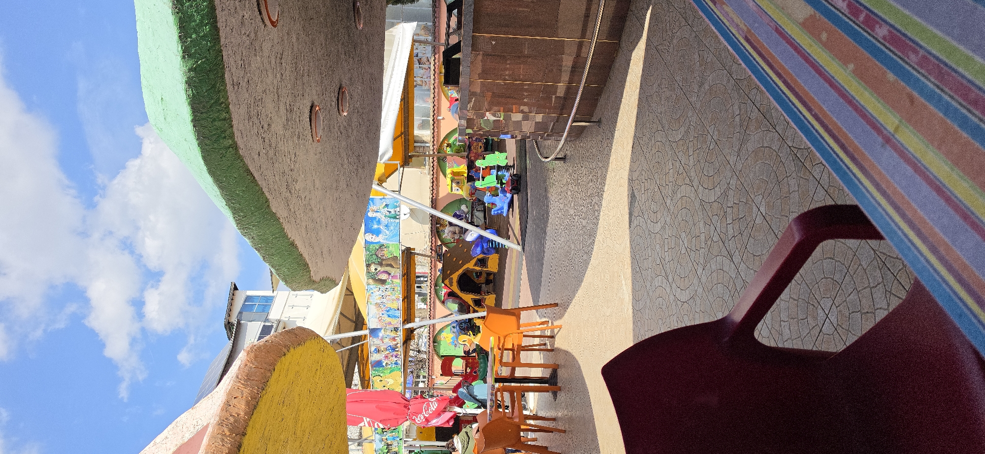 This image captures an outdoor leisure and play area located in Kazanlak, Bulgaria, under a clear blue sky with dispersed white cumulus clouds. The scene is illuminated by direct sunlight, casting distinct shadows. In the immediate foreground, a dark red plastic chair is partially visible on the lower left, while a multi-colored striped fabric, exhibiting hues of blue, green, yellow, orange, and purple, extends diagonally from the lower right. The ground is paved with patterned light brown and grey interlocking tiles. The midground features an outdoor cafe section with several sets of orange plastic chairs arranged around small, square metal tables. On one table, a white dish containing a green object is discernible. A partially open red Coca-Cola branded umbrella stands near this seating. Beyond the cafe tables, a vibrant children's playground is present, covered with soft, multi-colored interlocking mats. This playground includes various colorful structures: a yellow and brown playhouse-like tunnel, multiple blue and green animal-shaped spring riders, and other play equipment. Overhead, large, irregular canopies or structures, colored yellow on the left and green on the right, provide shade. A long, horizontal banner adorned with images of cartoon characters, including those from Masha and the Bear, Paw Patrol, and Frozen, stretches across the top of the playground area. A tall, reflective brown tiled structure with a silver horizontal handrail is situated on the right side of the midground. Several indistinct figures are present in the area; one individual wearing a green jacket is seated at a table on the far left. In the background, a multi-story white building with blue-tinted windows and solar panels on its roof is visible. Another building with multiple arched windows or decorative elements is also present behind the playground equipment.