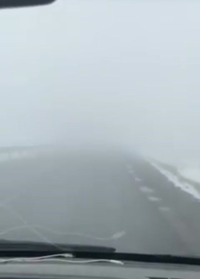 view from inside a car driving on a road with heavy fog