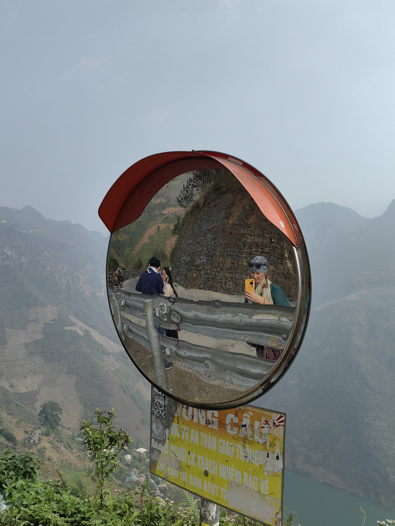 Captured in Mèo Vạc Commune, Vietnam, the image showcases a convex mirror, typically used to enhance road safety on bends