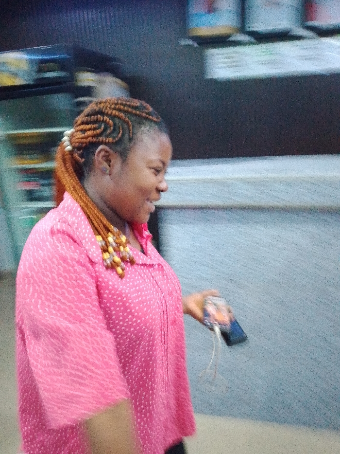 A woman in a pink, patterned blouse is depicted in a medium shot. She has elaborate, orange braided hair pulled back in a ponytail, some strands adorned with beads. She faces to the right, appearing to smile. Her left arm is extended, holding a dark-colored object connected to white cords. The background appears to be a blurry interior space with shelves and neutral-colored walls.