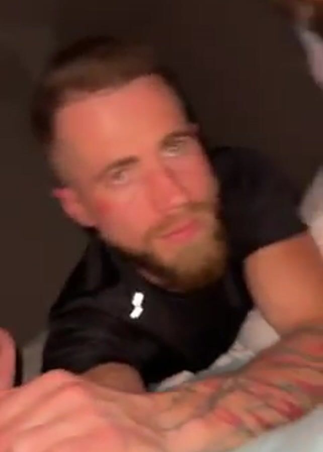 man and a young girl lying on a bed, possibly in a bedroom based on the low lighting and what is likely a headboard in the background. Initially, the man is closer to the camera, gesturing towards the camera, while the girl is to his side, looking at the camera. The girl then gets closer to the camera, opens her mouth wide, showing her teeth and tongue, and makes a noise. The camera is briefly obscured, before returning to show the man and girl, now closer together and laughing. The man has a beard and tattoos on his arm. The girl is wearing patterned pajamas. The lighting is dim, and the camera work is shaky, suggesting a handheld device.