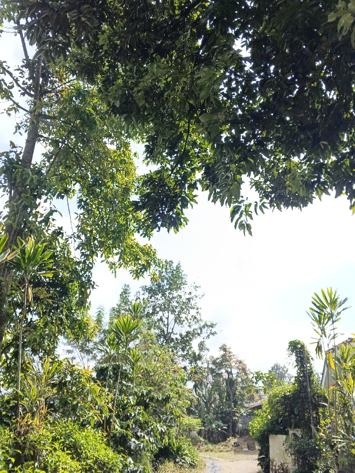 A narrow dirt path meanders through lush green vegetation. Towering trees with dense foliage form a canopy above, filtering sunlight. Various plants and shrubs line the path, creating a verdant scene. Hints of buildings peek through the foliage, suggesting a residential area. The sky is visible through gaps in the trees, appearing bright and slightly overcast.
