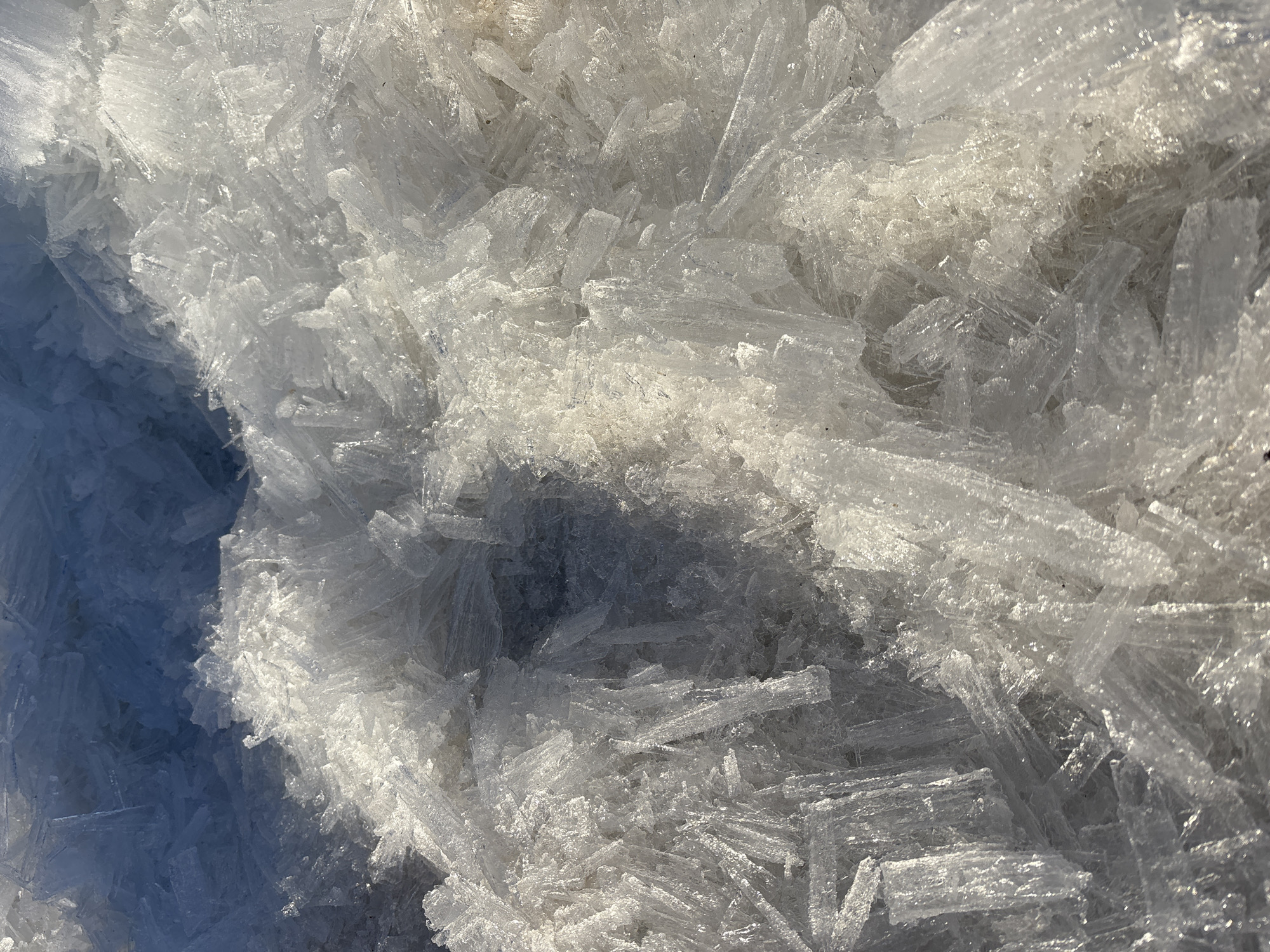 This image captures a close-up, high-angle view of densely packed, elongated ice formations