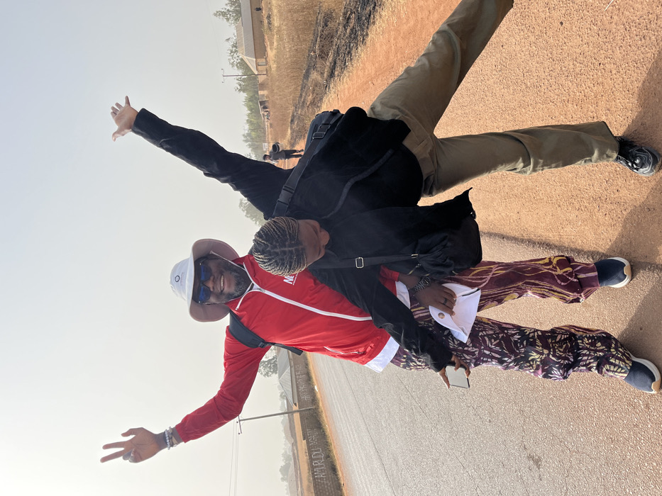 A forensic description of the scene depicts two individuals posing on a paved road under a hazy sky in Durimi, Nigeria. In the foreground, a male subject stands on the left, facing forward with a broad smile. He wears a white wide-brimmed hat with a dark emblem, dark sunglasses, a red zip-up jacket over a white undershirt, and distinctive patterned trousers in shades of maroon, purple, and yellow. His left arm is raised, hand displaying a peace sign, adorned with multiple bracelets and rings. His right hand holds a white mobile phone and a folded white paper. He wears dark athletic shoes with white soles. A black backpack is visible over his shoulders. To his right, a female subject poses with her left leg extended outwards and her arms raised upwards, creating a dynamic, playful stance. She wears her hair in braids, a black long-sleeved jacket, olive-green trousers, and dark athletic shoes. A black shoulder bag with a silver buckle strap hangs across her body. Her head is tilted down, and she appears to be smiling or laughing. The subjects are positioned on a two-lane paved road, which has a reddish-brown, dusty shoulder on both sides. In the midground, sparse, dry vegetation, some appearing burnt, lines the road. Several utility poles are visible on both sides of the road. On the left, a low wall or structure shows faded white graffiti, including the visible text "AMRULUDU." In the background, distant, low-lying structures, possibly simple dwellings or buildings with reddish-brown walls, are scattered across the landscape. Another individual is faintly visible walking further down the road on the right side. The sky is a uniform, pale white, indicating bright, possibly hazy, daylight conditions.