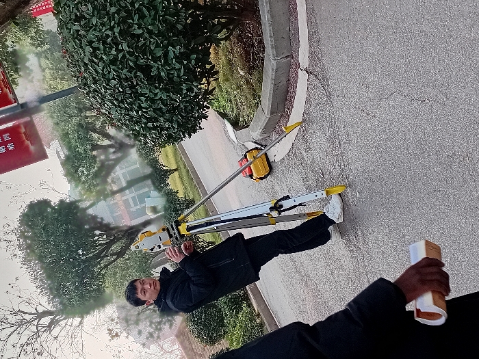A man operates surveying equipment on a paved surface near greenery and a curb. He stands beside a yellow and white tripod supporting an instrument. He is dressed in a black jacket and dark pants, wearing white shoes. He appears to be holding a cylindrical object in his hand. The surrounding environment includes trees, bushes, and a building with Chinese characters on it.