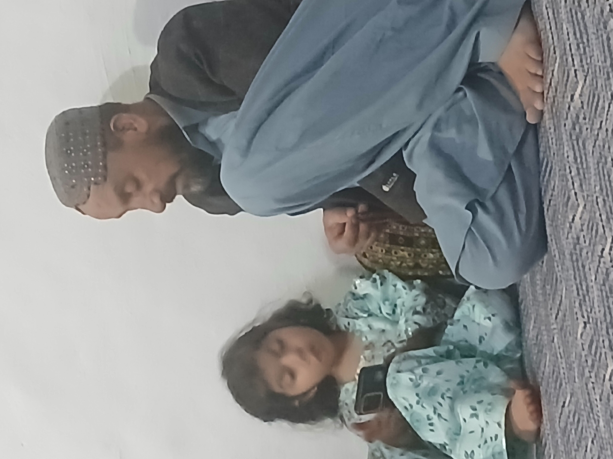 An indoor scene in Quetta, Pakistan, features two individuals: an adult male and a young girl, both seated on a patterned gray and white woven floor mat. The plain background is a light-colored wall. The adult male, positioned on the right, wears a gray, intricately patterned skullcap, a dark jacket over a light blue traditional shirt (kameez), and light blue baggy trousers (shalwar). He has a dark beard and is looking towards the child. His hands are clasped, and his feet are bare. A section of a brown and gold patterned object, possibly a cushion, is partially visible behind him. The young girl, positioned on the left, has dark, wavy hair and wears a light teal patterned dress or tunic. She holds a dark-colored mobile phone in both hands, her attention directed towards its screen. Her feet are bare.