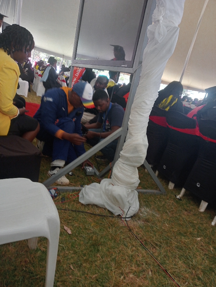 Under a white tent, a large screen displays a graduate. Two men work on electronics by the screen's support structure, which is wrapped in white fabric. A woman in a yellow jacket stands nearby. Rows of people in black robes with red trim sit in the background. Cables snake across the grassy ground around a white plastic chair.
