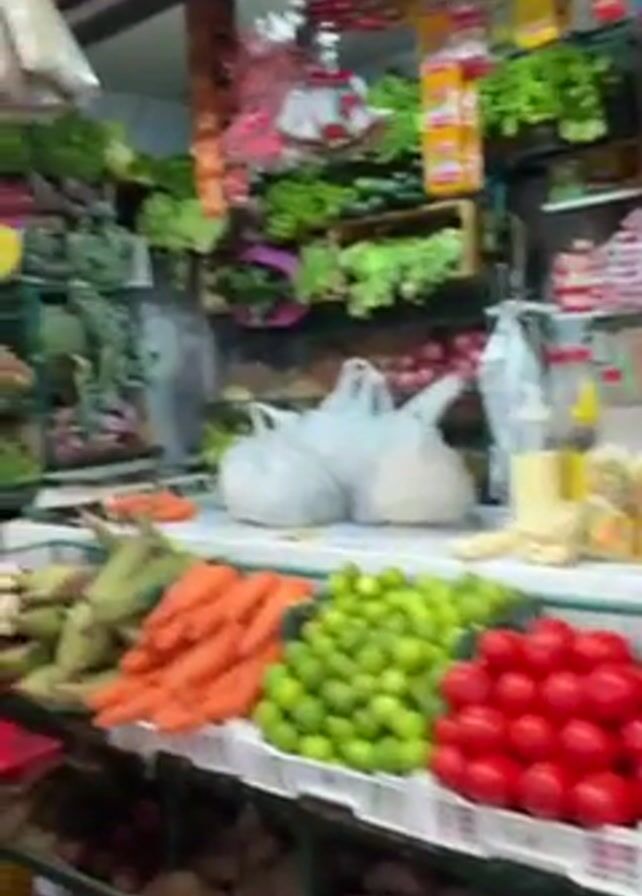 The camera pans across a bustling vegetable stand in a marketplace. The stand is piled high with fresh produce including carrots, limes, tomatoes, onions, potatoes, and various greens. Packaged goods are displayed on shelves behind the produce. Several people are present, including customers shopping and vendors tending to the stand. One customer wearing a black hoodie moves along the front of the stand.