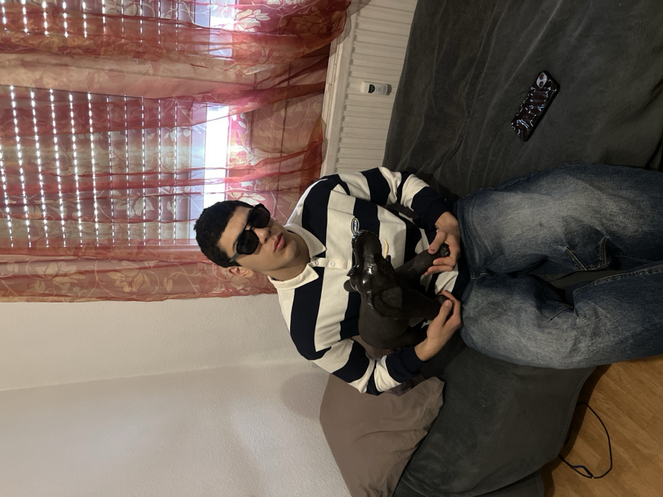 - "A person wearing sunglasses and a striped shirt is reclining on a sofa, holding a dark, sculpted object" by FM-uZazy2, licensed under CC BY 4.0