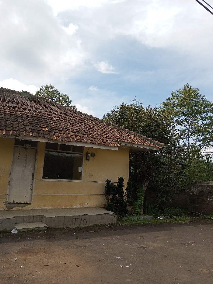 The scene depicts the exterior of a single-story structure in Kandenuwara, Sri Lanka, viewed from a low angle. The building features faded yellow-cream colored walls, a brown terracotta tiled roof, and a concrete foundation. A distressed, light-colored wooden door is situated on the left, with a horizontal rectangular window to its right. A utility meter box is mounted on the wall between the window and the building's right edge. In front of the building, a raised concrete platform with steps leads to the door, marked with "T/O" in black. The immediate foreground consists of a dark, unpaved ground surface with scattered debris. Dense green vegetation, including small conifer-like bushes, is present along the building's right side, extending into the background, where taller trees are visible. A weathered concrete or stone wall is partially obscured by foliage on the far right. The sky overhead is partially cloudy with patches of blue. No individuals, actions, or interactions are present.