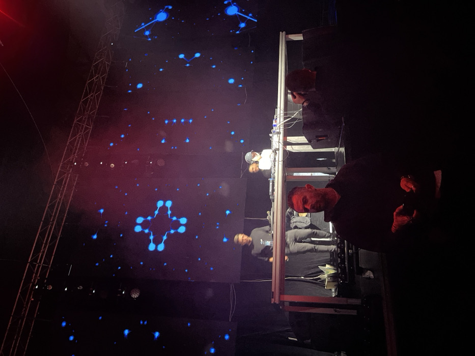 A stage features a large screen displaying blue molecule-like graphics against a dark backdrop, illuminated by red stage lights. A metal truss structure stands on the left. On the right, a multi-level platform holds sound equipment. Three individuals are working at the platforms, dressed casually, their faces visible. The photo is oriented sideways with the left of the original view now at the top. The scene is dimly lit, casting shadows.