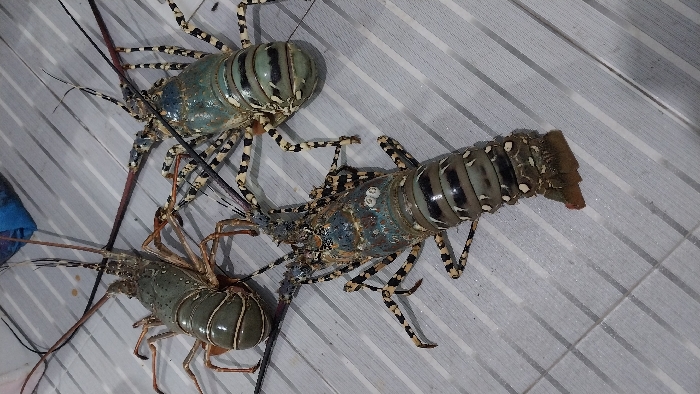 - "Three spiny lobsters are positioned diagonally on a light grey tiled surface with parallel stripe patterns, indicative of a floor, in Bireuen, Indonesia" by FM-t5Tl43, licensed under CC BY 4.0