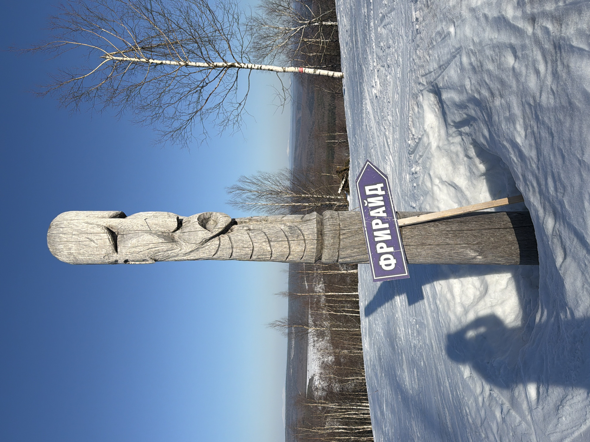 A tall, weathered wooden sculpture, resembling a stylized human figure or totem pole with carved facial features, stands centrally on a snow-covered slope under a clear blue sky. The sculpture is dark grey-brown, exhibiting prominent wood grain. Attached to its lower section is a purple, arrow-shaped sign with white Cyrillic text spelling "ФРИРАЙД" (Freeride), pointing to the right. This sign is supported by a slender wooden stake embedded in the snow. The foreground consists of undisturbed white snow with subtle undulations and faint tracks. In the mid-ground and background, numerous leafless deciduous trees, primarily birches with visible white bark, are scattered across a forested landscape. Beyond these trees, a vast expanse of dark forest extends to a distant, hazy mountain range or elevated terrain under the horizon. A distinct shadow of a person holding a camera or phone is cast onto the snow in the lower-left foreground. The scene is situated on a snowy mountain slope, characteristic of a ski resort area in Gubakha, Russia.